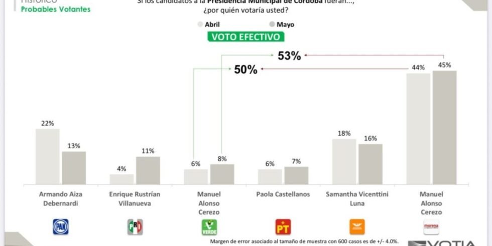A menos de una semana de la elección, la más reciente encuesta de VOTIA confirma lo que ya se siente en las calles: Manuel Alonso Cerezo y la coalición MORENA–PVEM arrasan en Córdoba. Con un 53% de las preferencias electorales efectivas, Alonso aventaja por 37 puntos a su más cercano competidor, consolidando una tendencia de crecimiento firme y sostenido desde el inicio de la campaña.